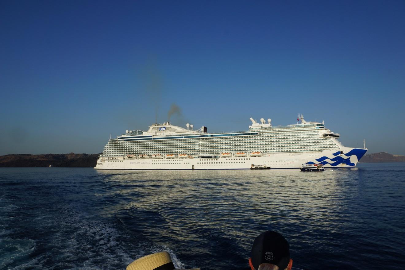 9月24日撮影 沖止めのサントリーニ島はテンダーではなく地元の遊船で往復、乗った船を撮る大チャンスです。 |