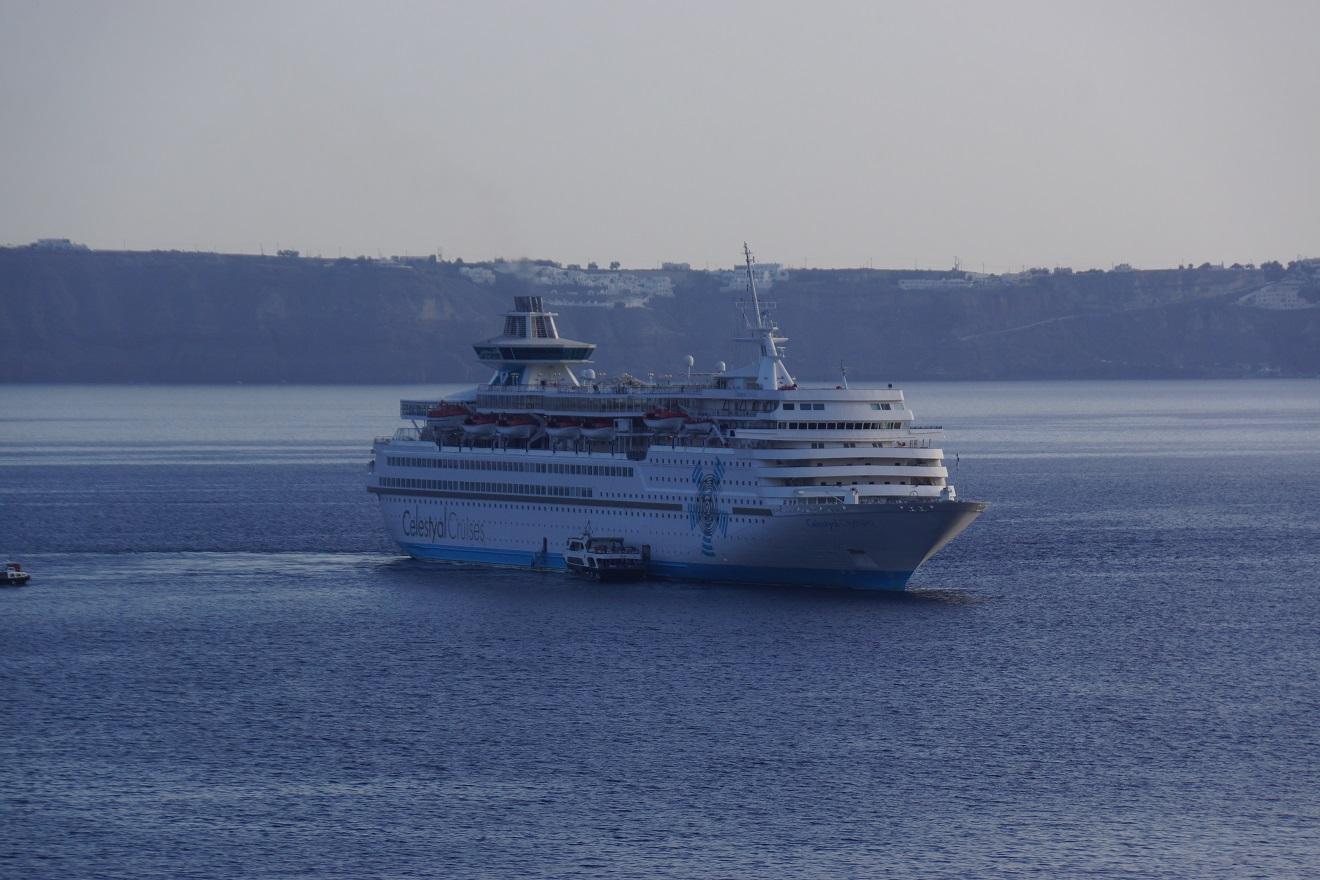 9月24日撮影 サントリーニ島観光から帰って船に戻ると、船尾方向遠くに停泊する船影を見つけました。 |