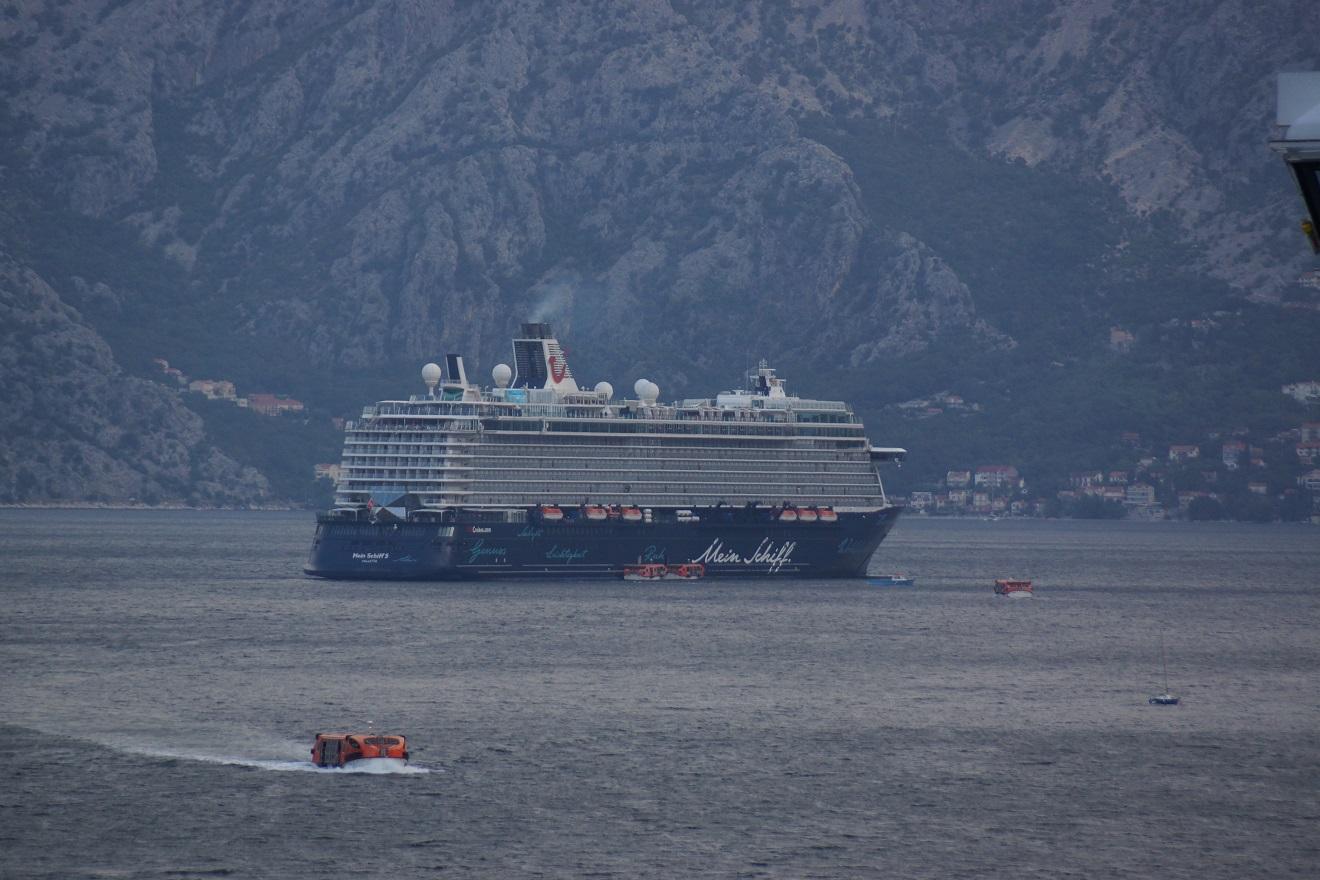 9月26日撮影 コトルは狭いフィヨルドの奥にある港ですが、かなり手前で上陸用のテンダーに囲まれたクルーズ船は、船体に何か落書きがいっぱい? |
