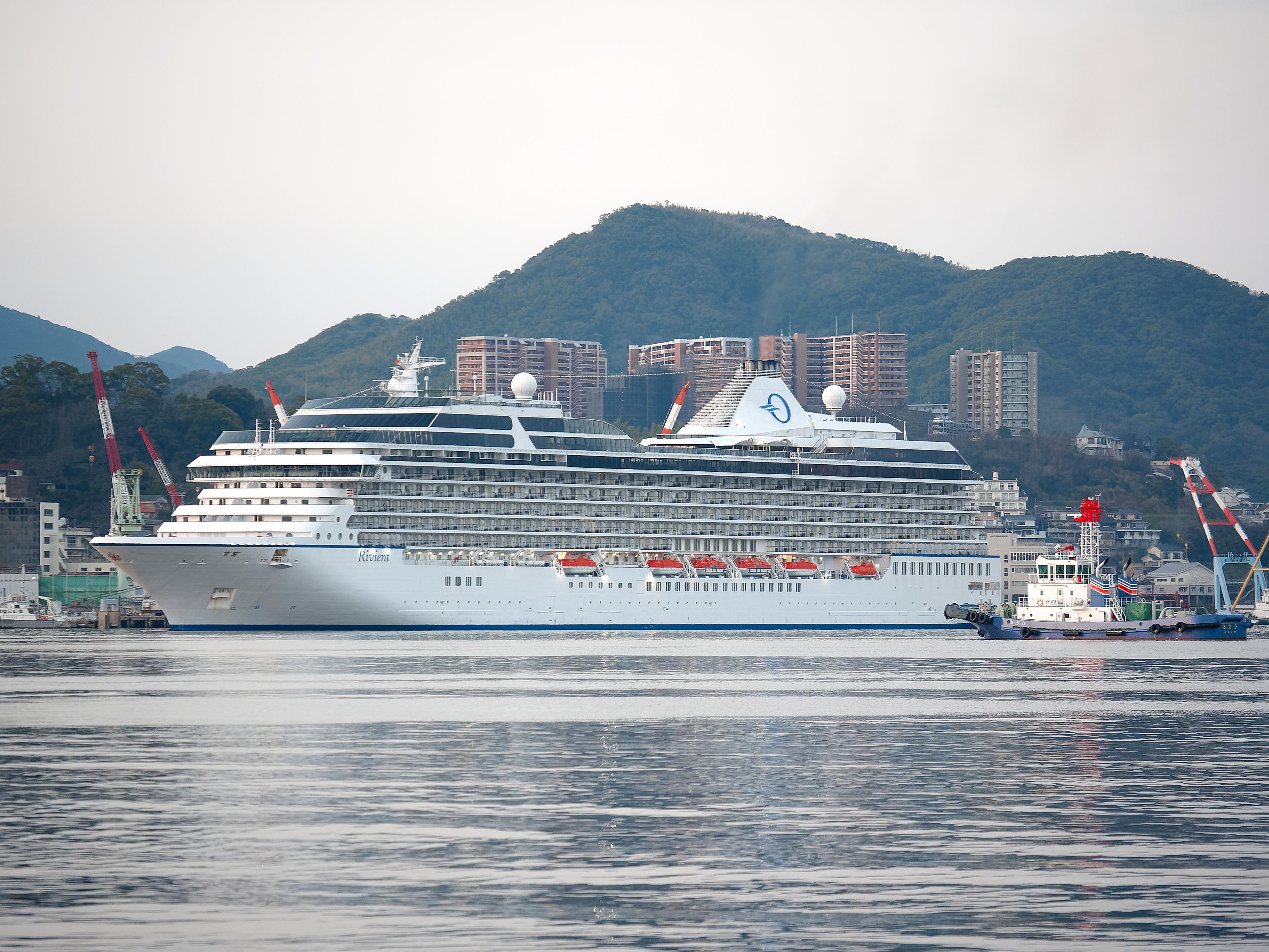 タグボートに見守られて入港する「リビエラ」(2024年3月7日撮影)。 |