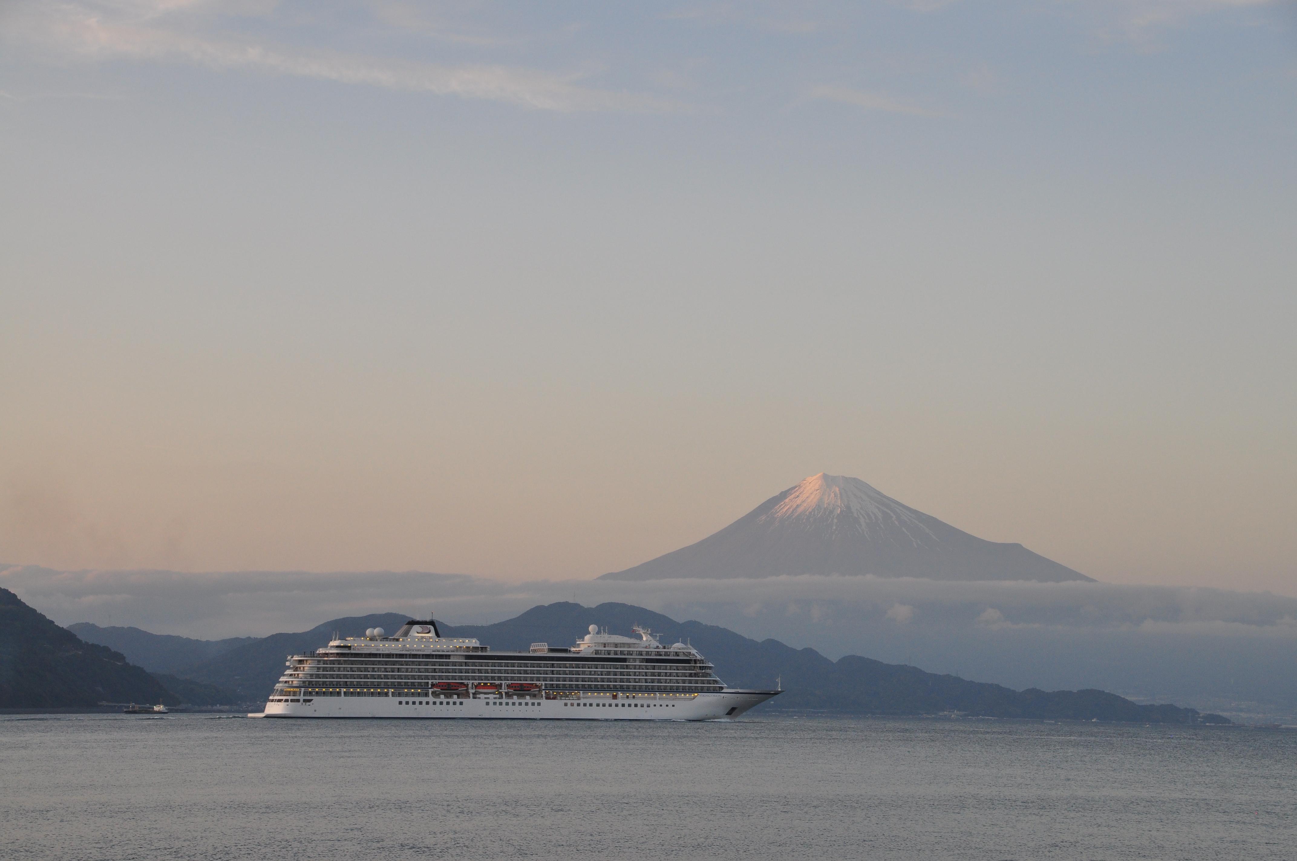 富士山とクルーズ船の写真は,日本らしく美しいですね。このように港から土地を象徴するような山が見える場所は世界でも少ないかもしれませんね。Vikingのクルーズ船も船型が美しいです。