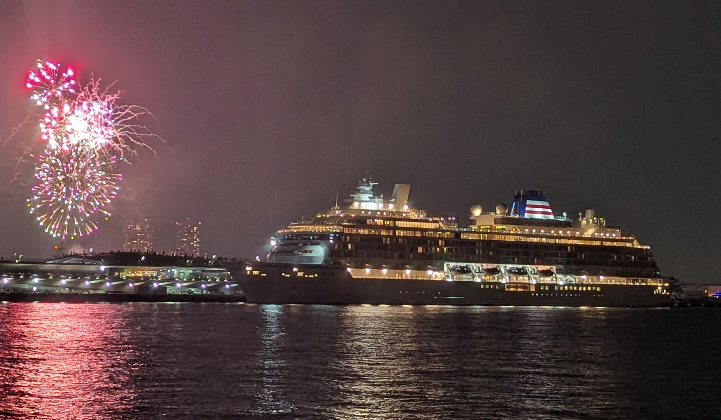 開港祭の花火の打ちあがる中,初入港の「飛鳥III」が大さん橋に佇んでいました。 |