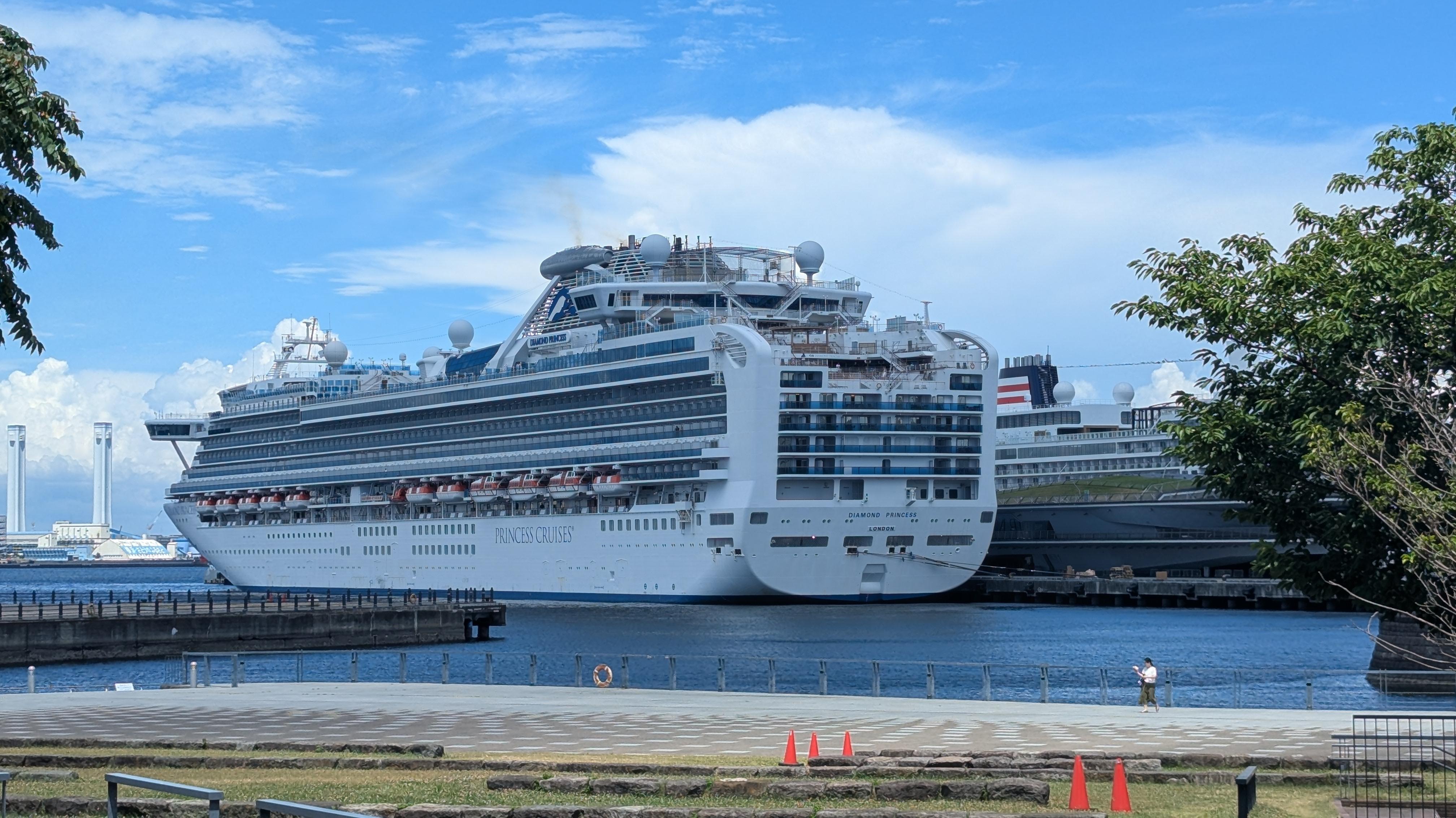 夏の横浜港大桟橋に飛鳥3とダイヤモンドプリンセスが停泊していました。 |