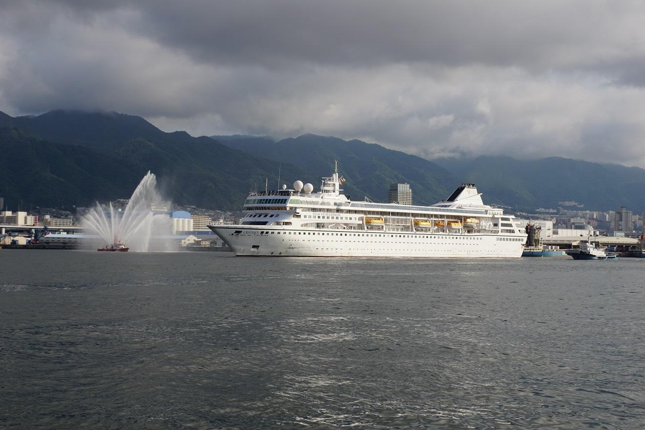 8月18日撮影 2023年Villa Vie Residencesへ転売移籍でODYSSEYに改名!主が代わり、名を替えての初入港と云うことで、消防艇の歓迎放水を受けながら入港です。 |