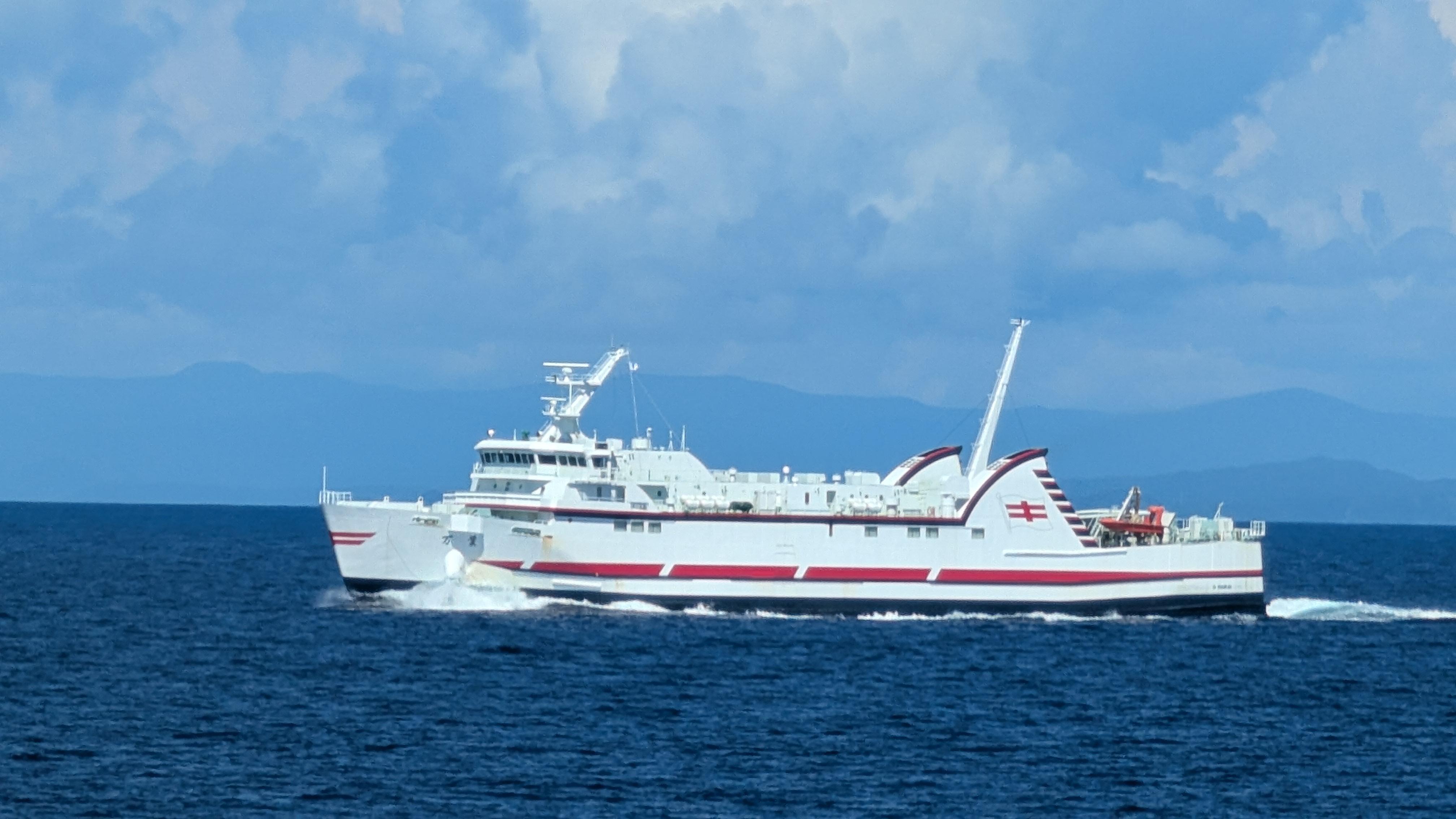 九州商船株式会社 (Kyusyu Shosen Co.,Ltd.) 運航。 Built: 2011, IMO: 9610133, MMSI: 431002428 Gross tonnage: 1,560t, Length: 85.6m, Beams: 10.7m |