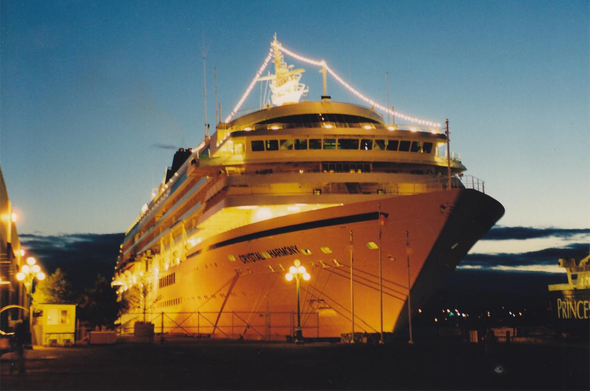 夕暮れの波止場に停泊している「クリスタルハーモニー」です。夏場はアラスカクルーズの途上、しばしばビクトリアに寄港しました。 |