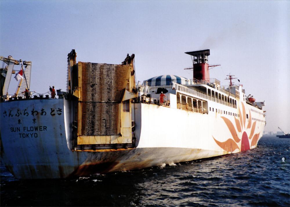 長い航海を終え、東京港に入港する「さんふらわあとさ」。錆が目立つ船体が痛々しいが既に20年近く同航路をキープしていたベテラン。 |