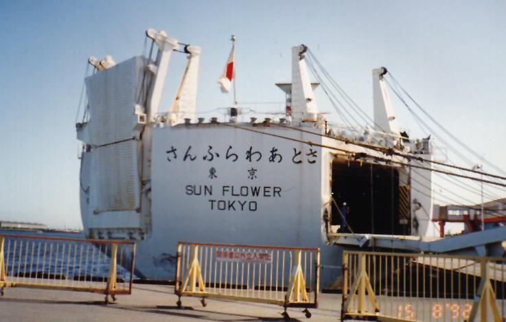 東京港に着岸中の「さんふらわあとさ」を後部から据えたシーン。「さ」の字の字体が船名変更があったことを示している。 |