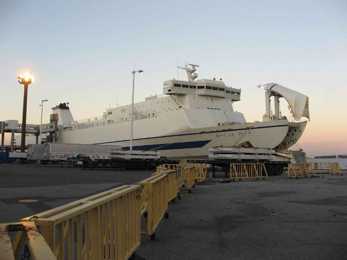 東京港で荷役中の「おーしゃんのーす」です。久しぶりに行った東京港フェリー埠頭でしたが、道にかなりの数のバリケードが置かれており、放置駐車対策のためか道もかなり狭くなっており、フェリーの発着が少なくなったフェリー埠頭周辺の道路もかなりすさんだ感じでした。はやく元通りにフェリーでにぎやかになるといいのですが。 |