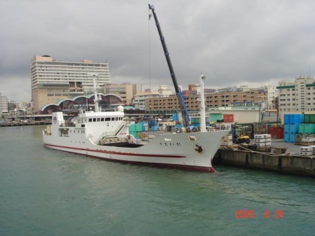 新「だいとう」の写真に続き、旧「だいとう」の写真も投稿いただきありがとうございます。どちらも沖縄県の離島、南北大東島へ渡るための唯一の定期船ですね。籠に載せられて上陸するというユニークな上陸方法も興味深いです。