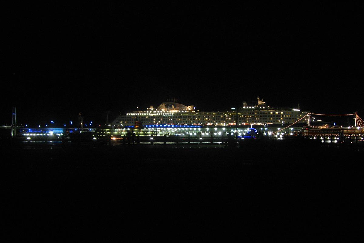 夕刻、出港前に赤レンガパークを通ったときに撮影しました。夜闇に光る客船の明かりがとても美しく宝石のようでした。手前に伊豆七島航路の東海汽船「かめりあ丸」が一緒に写っているのにお気づきでしょうか・・・。大きさの差が一目瞭然です。 |