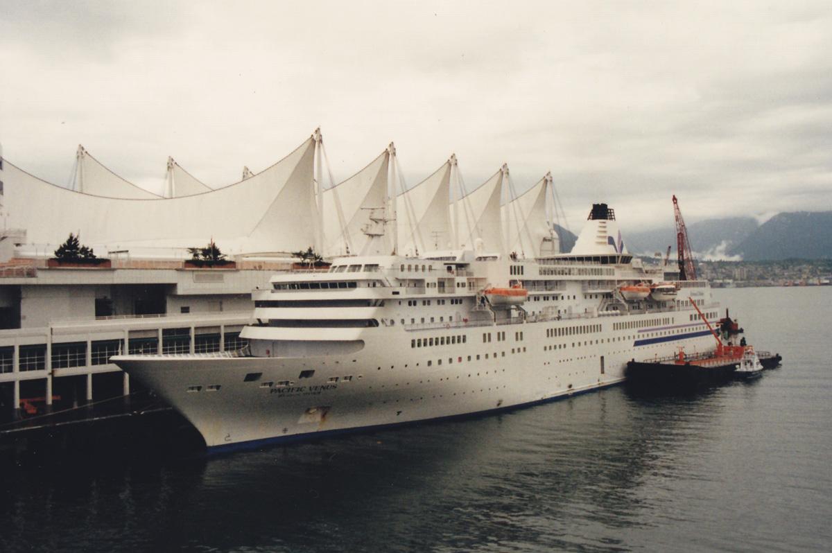 アラスカクルーズでバンクーバーに寄港した時のショットです。美しい帆船の帆の形をした客船ターミナルと美しい「ぱしびい」の船体が絵になっていました。客船ターミナルはかなり大型客船も接岸できるのですが、「ぱしびい」はわすか二万トン強、今後は日本船でもメガシップが就航してほしいものです。 |