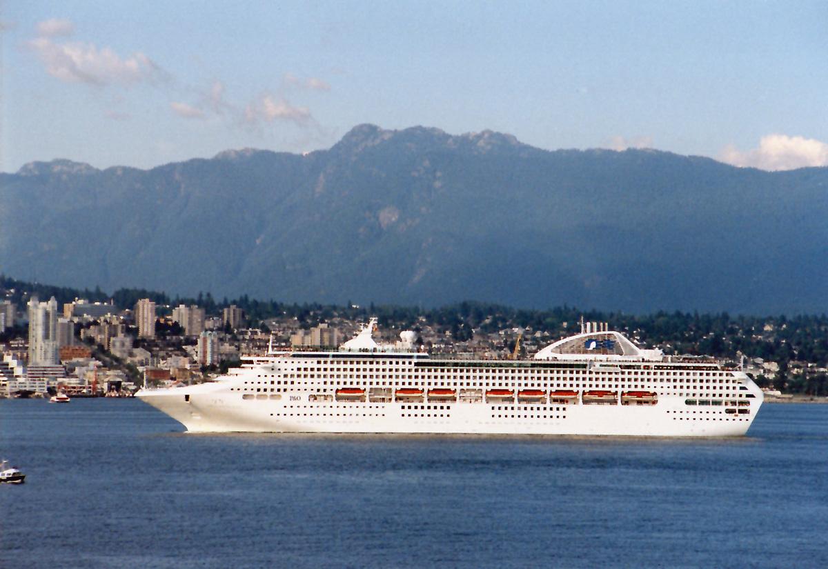 スタンレーパークからみた「ドーンプリンセス」です。ノースバンクーバーの山並みを背にアラスカクルーズに旅立っていきます。 |