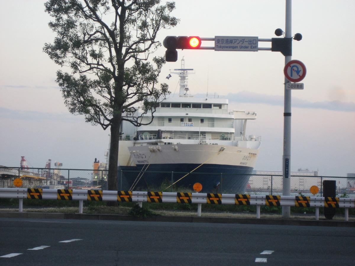 レインボーブリッジを降りて東京湾岸アンダーを出ると目の前に巨大な船が・・・。琉球海運の「わかなつ」です。もしかすると最近のフェリーよりも客船らしいRORO船ですね。早く旅客取扱を再開してほしいものです。 |