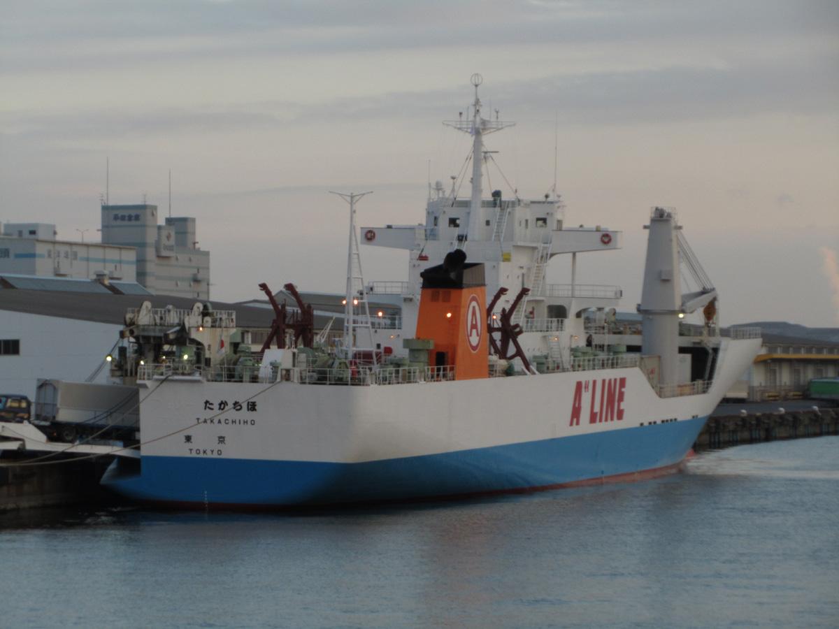 青梅地区からみた「たかちほ」です。貨物フェリーで旅客の扱いはしていないのですが、美しい船型です。 |