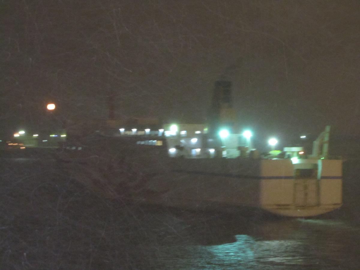 苫小牧港に停泊する「いしかり」から撮影しました。立っているのも大変なほどの吹雪の中、暗闇の海へ旅立っていきました。手前に見える白い線は雪です。 |
