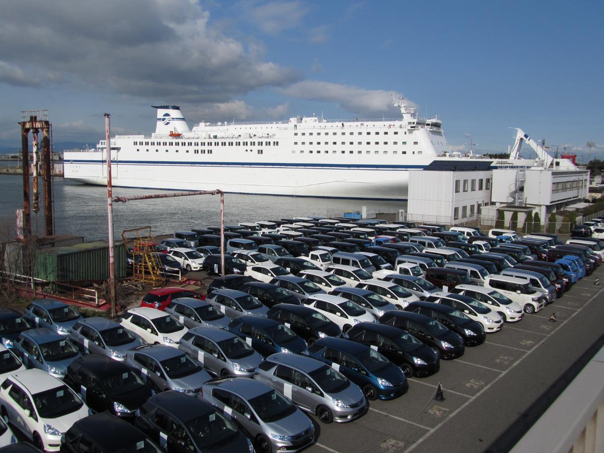 輸出待ちのホンダ車をたくさん並んだ背景に美しい「いしかり」が。自動車生産地ならではの光景です。 |
