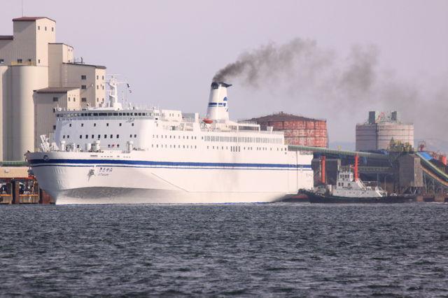 タグボートに押されて、フェリーターミナルに着岸する太平洋フェリー「きたかみ」です。 |
