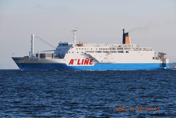 マルエーフェリー株式会社 (A-Line Ferry Co., Ltd.) 運航。 Built: 2008, IMO: 9423310, MMSI: n/a Gross tonnage: 8,083t, Length: 145.0m, Beams: 24.0m |