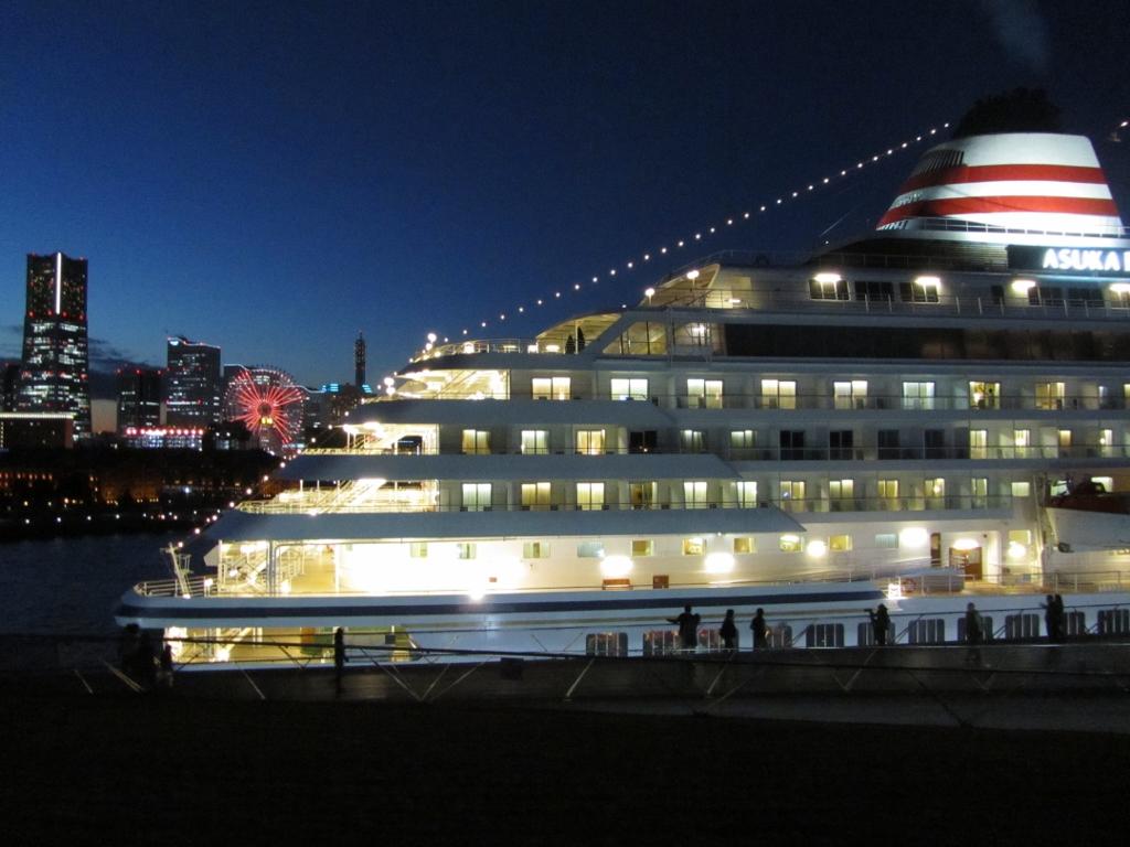 横浜港大桟橋に停泊していた「飛鳥 II」です。対岸には「ふじ丸」が対岸に停泊していました。当日は夕日がとても美しく見えていました。 |