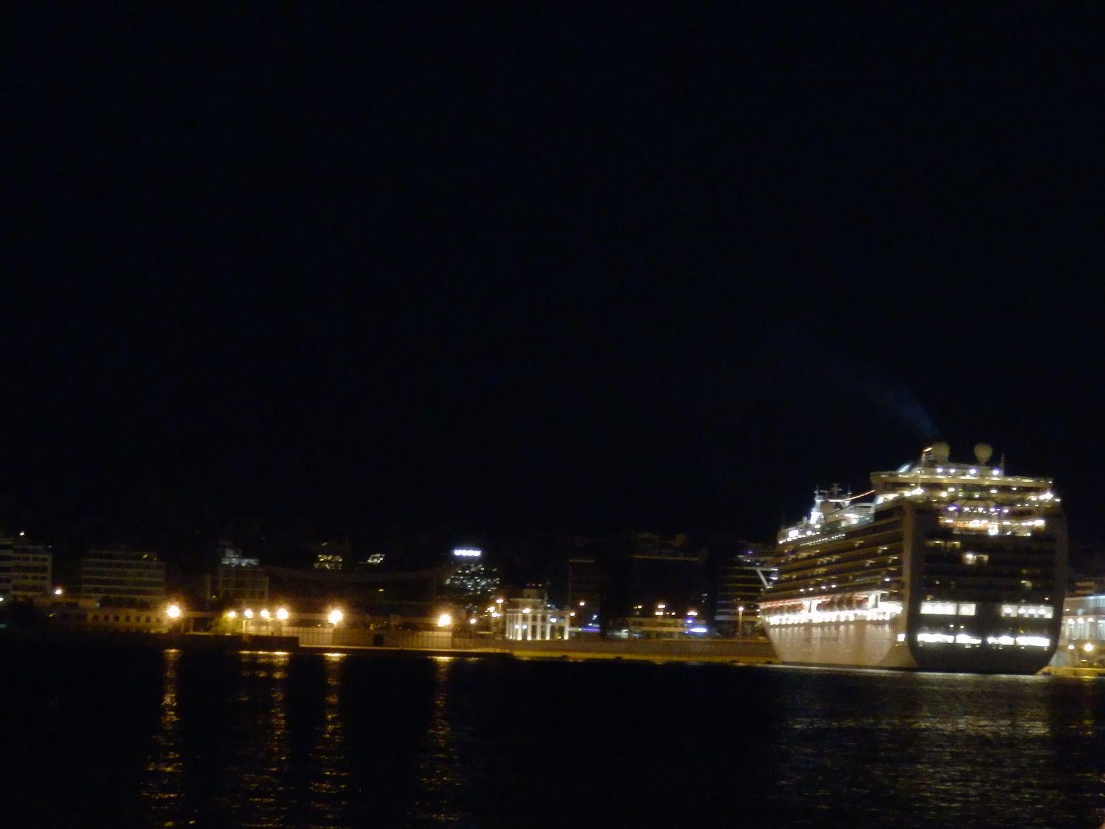 夜闇に輝く大きなクルーズ客船です。 |